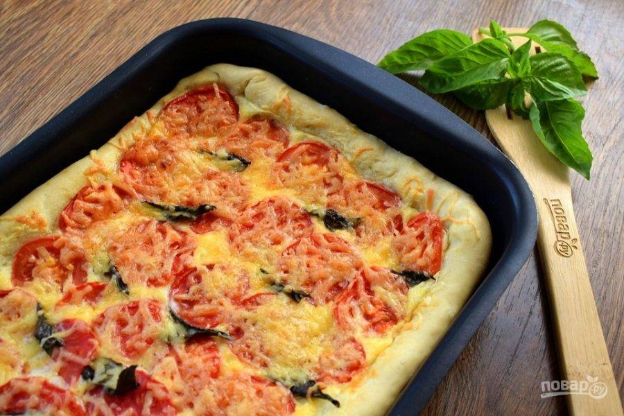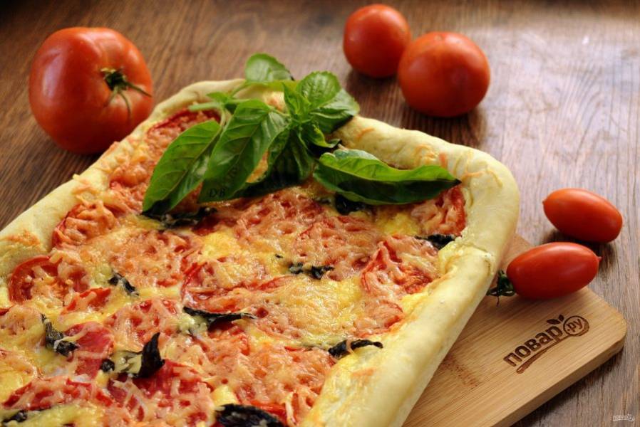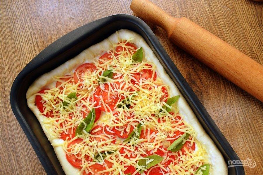 Сверху выложите помидоры, нарезанные тонкими кружками. Между ними разместите листья базилика и присыпьте тертым сыром. Отправьте пирог запекаться в разогретую до 180 °C духовку на 40-45 минут. Ориентируйтесь по своей духовке.