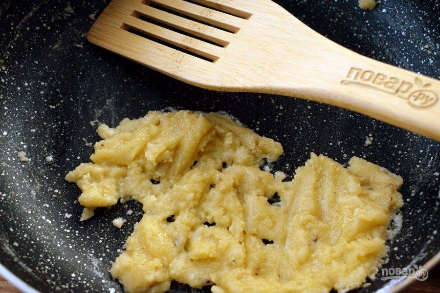 Высыпьте муку и перемешайте до однородности. Обжарьте до появления орехового запаха.