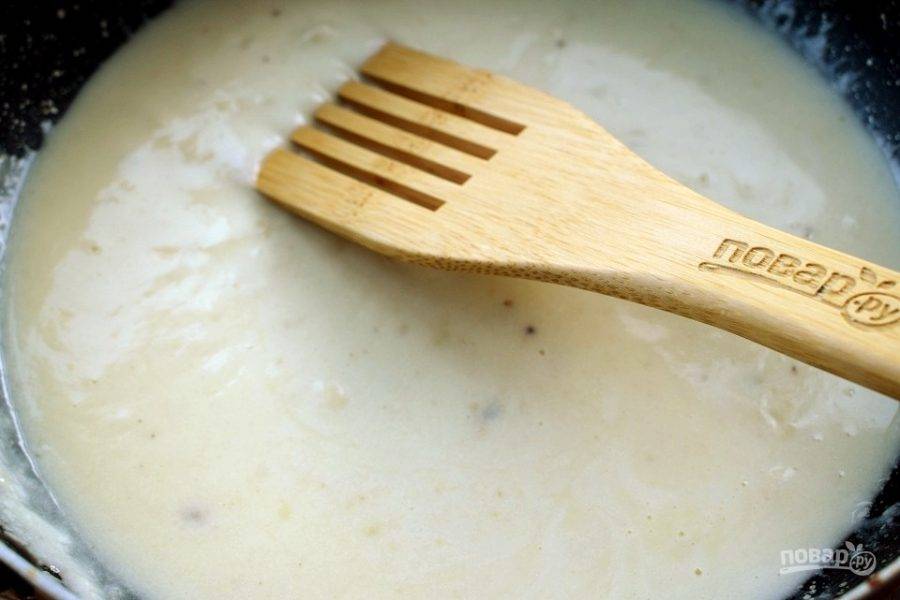 Влейте молоко, перемешайте до однородности, готовьте до загустения соуса, периодически помешивая. Остудите.