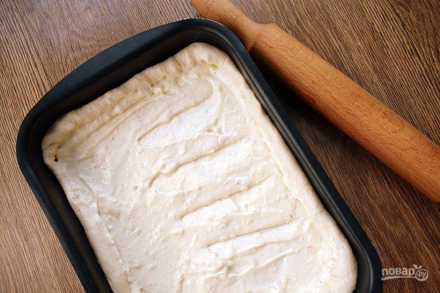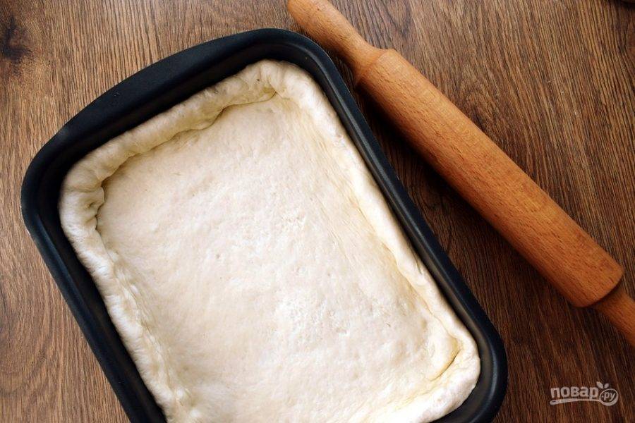 Тесто обомните, раскатайте в тонкий пласт и выложите в форму для запекания, формируя невысокие бортики.