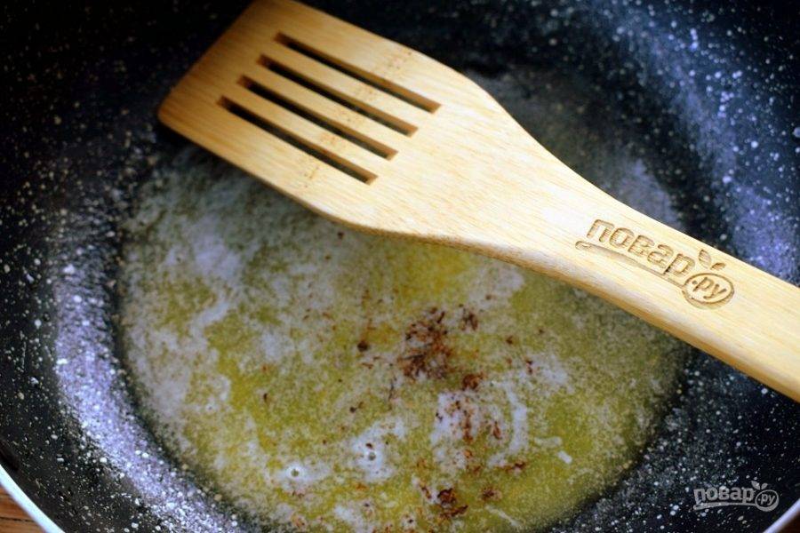 Приготовьте соус "Бешамель". Сливочное масло растопите в глубокой сковороде. Добавьте мускатный орех.