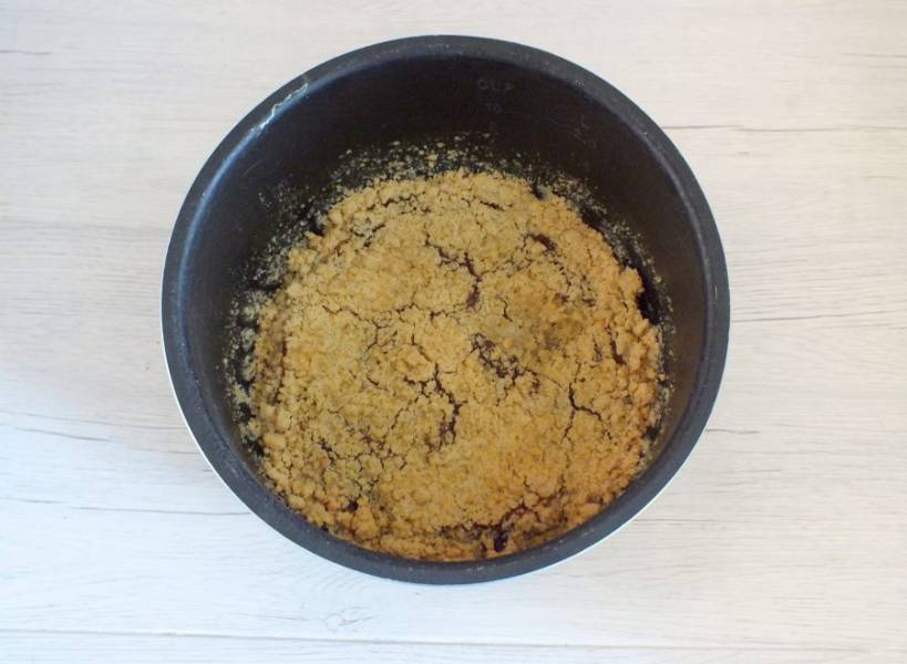 Чашу мультиварки смажьте обильно маслом. Масляно-мучную крошку визуально разделите на две части. Одну часть высыпьте в чашу мультиварки и слегка примните.