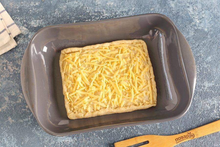 Защипните края любым удобным способом и посыпьте верх тертым сыром. Запекайте в духовке при температуре 180 градусов около 25 минут.
