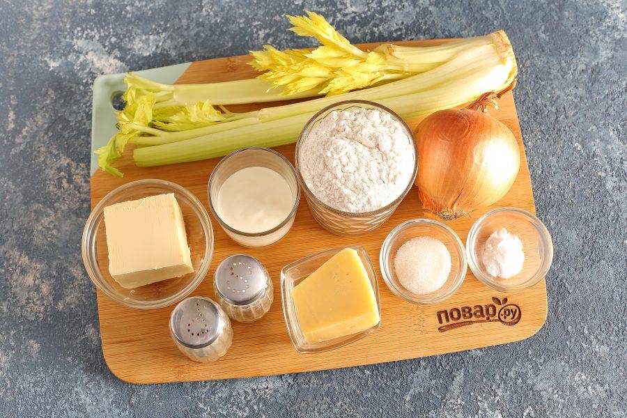 Нарежьте произвольно лук и сельдерей. Обжарьте на сливочном масле периодически помешивая до мягкости, посолите и поперчите по вкусу. Начинка готова.