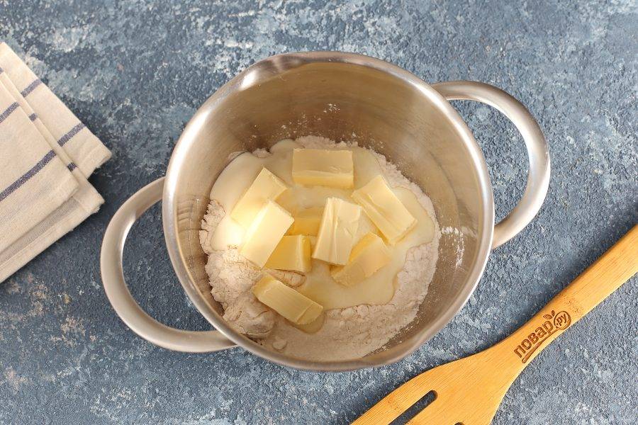 Соедините муку, масло, сметану, соль, сахар и соду.