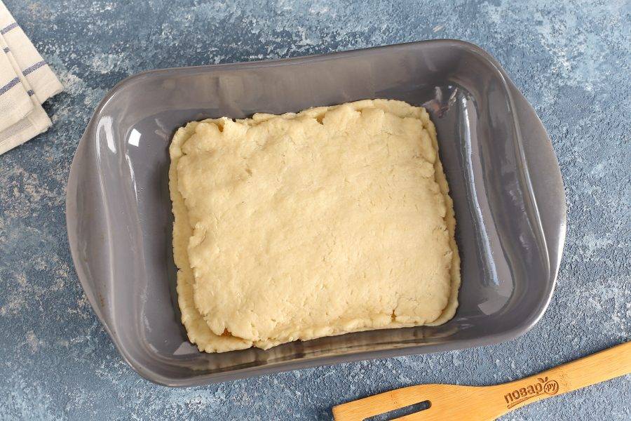 Тесто разделите на 2 части. Раскатайте первую часть на смазанной маслом поверхности в форме прямоугольника толщиной 3-4 мм. и аккуратно перенесите на противень или в форму.