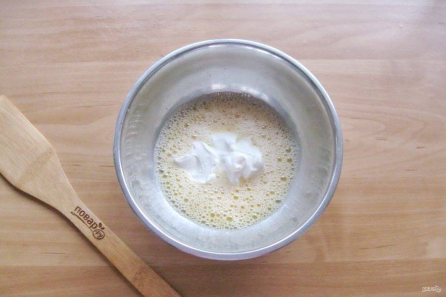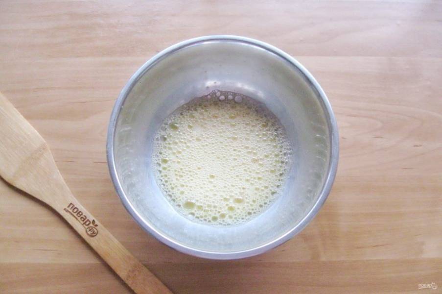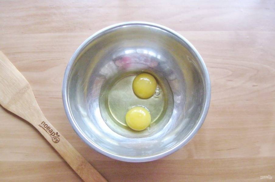 Приготовьте тесто для пирога. В миску выложите яйца.
