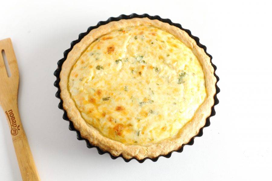 Выпекайте пирог в духовке при температуре 180 градусов около 40 минут. Верх должен подрумяниться. Пирог с сыром готов.