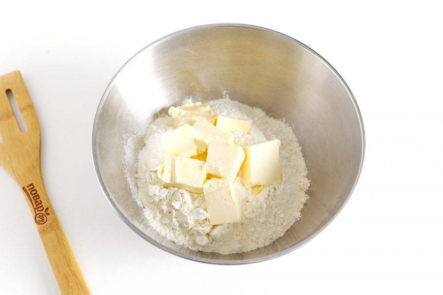 В глубокую миску насыпьте муку. Добавьте соль, разрыхлитель и нарезанное кубиками масло.