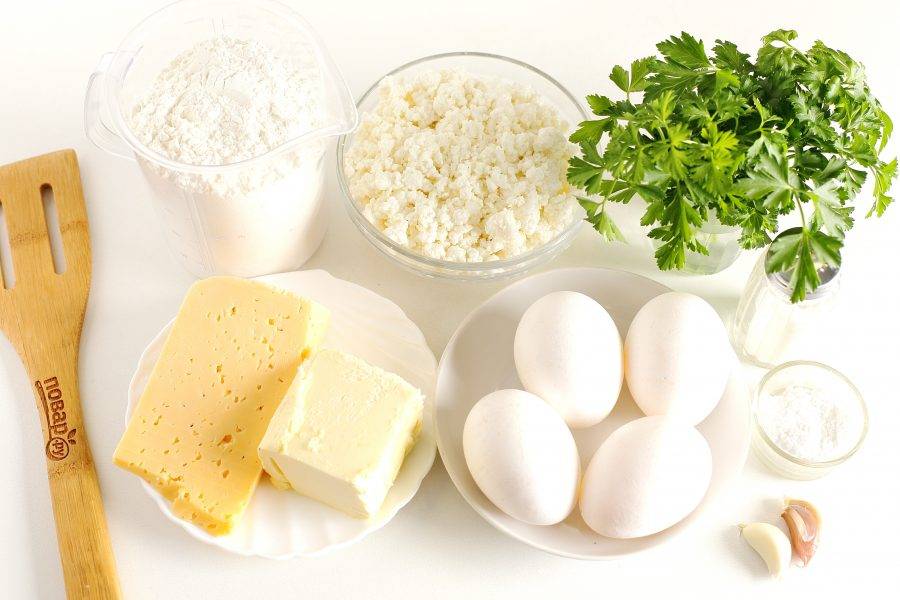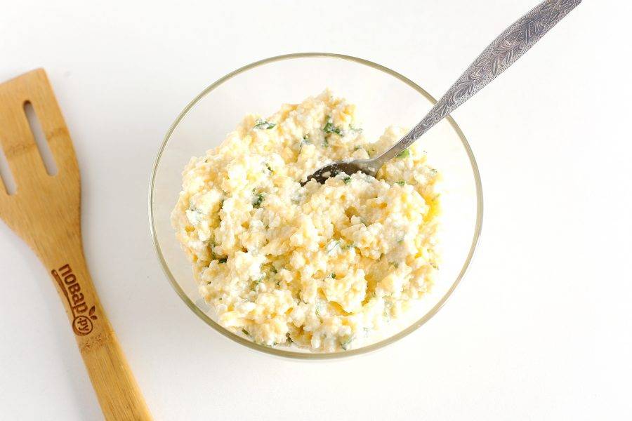Смешайте тертый сыр, творог и яйца. Добавьте пропущенный через пресс чеснок и измельченную зелень. Все тщательно перемешайте и посолите по вкусу. Начинка готова.
