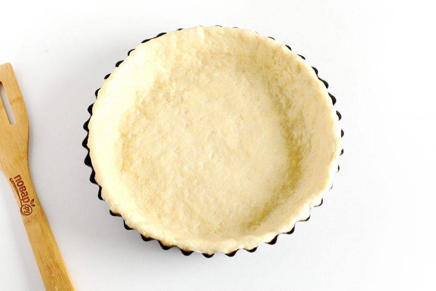 Выкладываем тесто в форму, предварительно смазанную маслом. Руками сформируйте бортики. Форма размером 22-26 см. в диаметре.