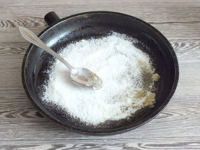 Возьмите форму или сковороду, в которой будете выпекать пирог. Растопите в ней отложенный кусочек масла (50 грамм). Добавьте 0,75 стакана сахара и на среднем огне, помешивая, растопите сахар. У вас должна получиться карамель. Аккуратно, массой можно сильно обжечься!