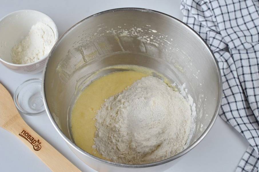 Добавьте большую часть муки и разрыхлитель. Перемешайте.