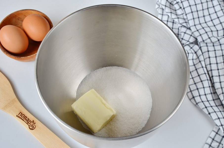 Масло сливочное (комнатной температуры) соедините с сахаром, миксером взбейте до пышности.