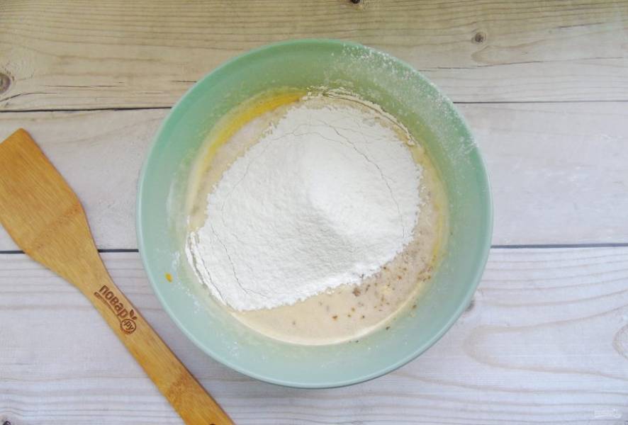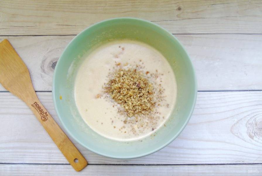 Грецкие орехи подсушите в духовке или на сухой сковороде. Измельчите любым способом и добавьте в тесто.