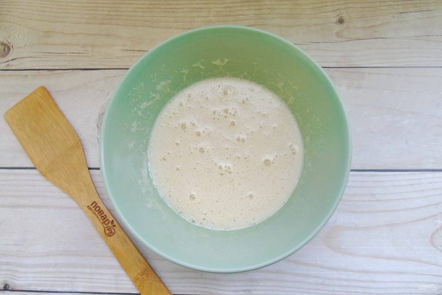 После выложите в миску. Добавьте соду, погашенную уксусом или лимонным соком.