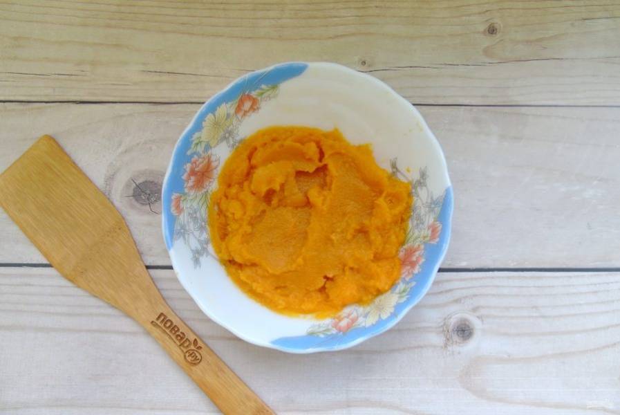 Тыкву очистите, помойте, нарежьте и запеките в духовке или микроволновке. Взбейте блендером до консистенции пюре.