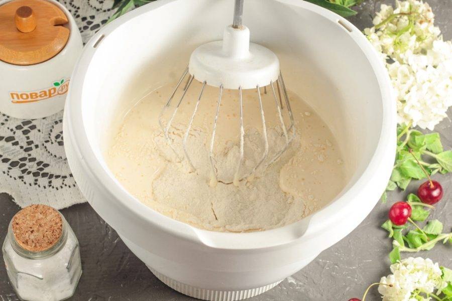 Вмешайте пшеничную муку высшего сорта, но не взбивайте ее, чтобы не выпустить пузырьки воздуха.