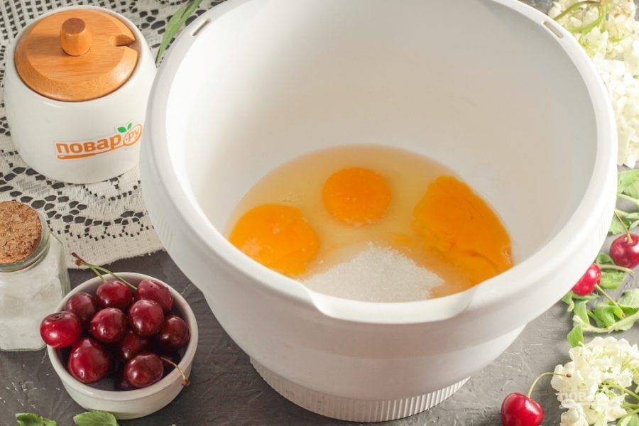 Куриные яйца вбейте в емкость миксера или кухонного комбайна. Всыпьте соль и сахар, взбейте все в течение 3-5 минут в пышную пену на высокой скорости техники.