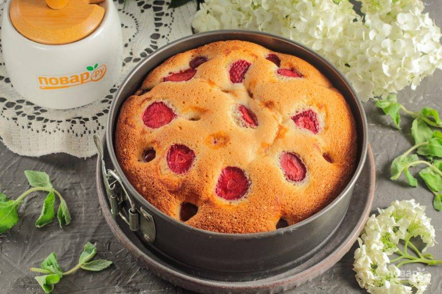 Пышный, воздушный и очень вкусный пирог с вишней и клубникой можно приготовить не только в летний сезон. Если такие ягоды есть у вас в наличии замороженными, то используйте их!
