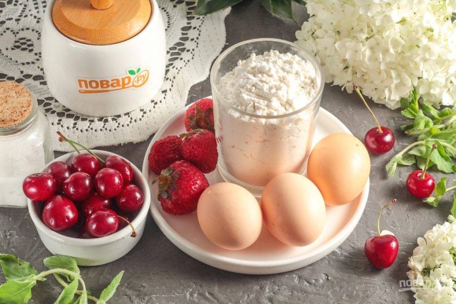 Промойте ягоды в воде, обсушите бумажными салфетками. Удалите из вишни косточки, а с клубники — хвостики. Если клубника крупная, то нарежьте ее ломтиками. Разогрейте духовку до 180 градусов. Смажьте форму для запекания маслом и выложите в нее тесто. Поверх теста распределите клубнику и вишню.