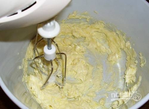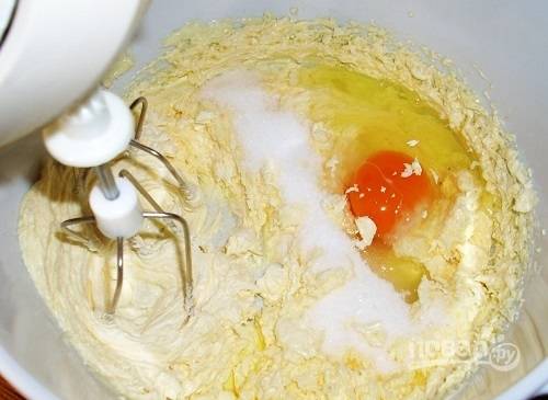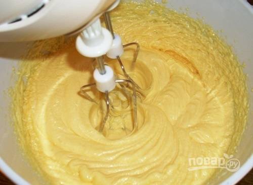 Добавляем по одному яйца и по ложке сахара и взбиваем. Добавим и ванильный сахар.
