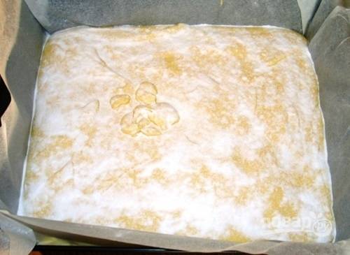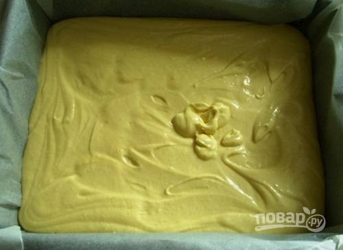 Форму для выпечки застилаем пергаментом, выливаем в нее тесто. Разравниваем.