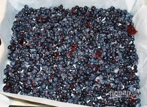 И выкладываем ровным слоем замороженные ягоды. Надеюсь, у вас они без кусочков льда?