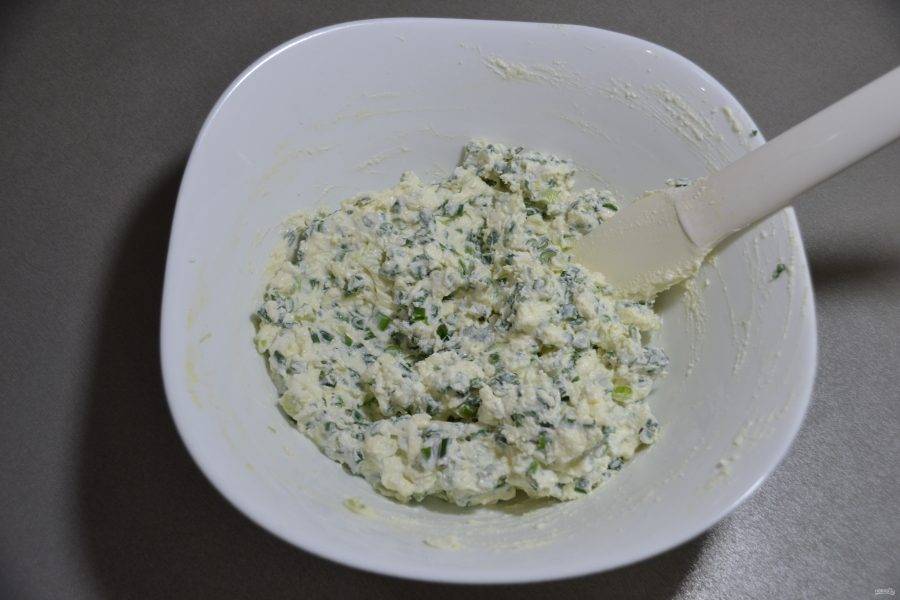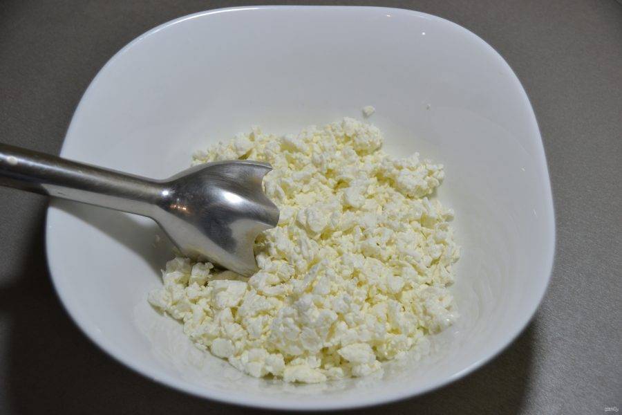 Приготовьте начинку. Если творог крупинчатый, пробейте его блендером или протрите через сито.