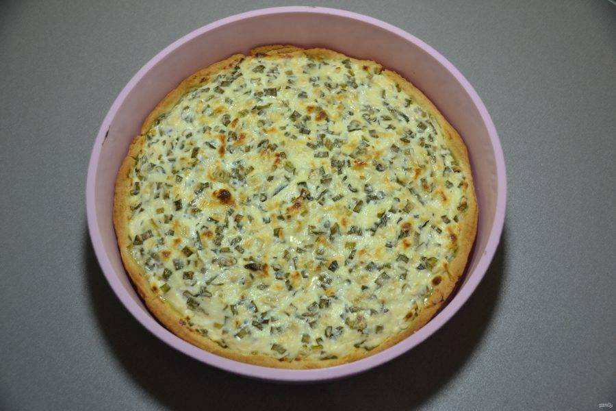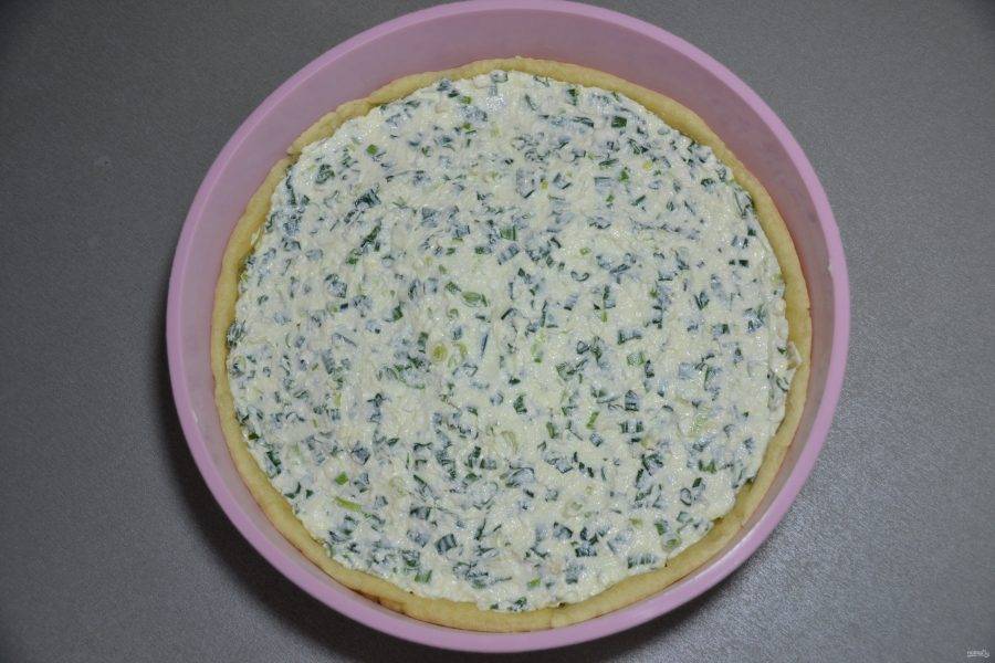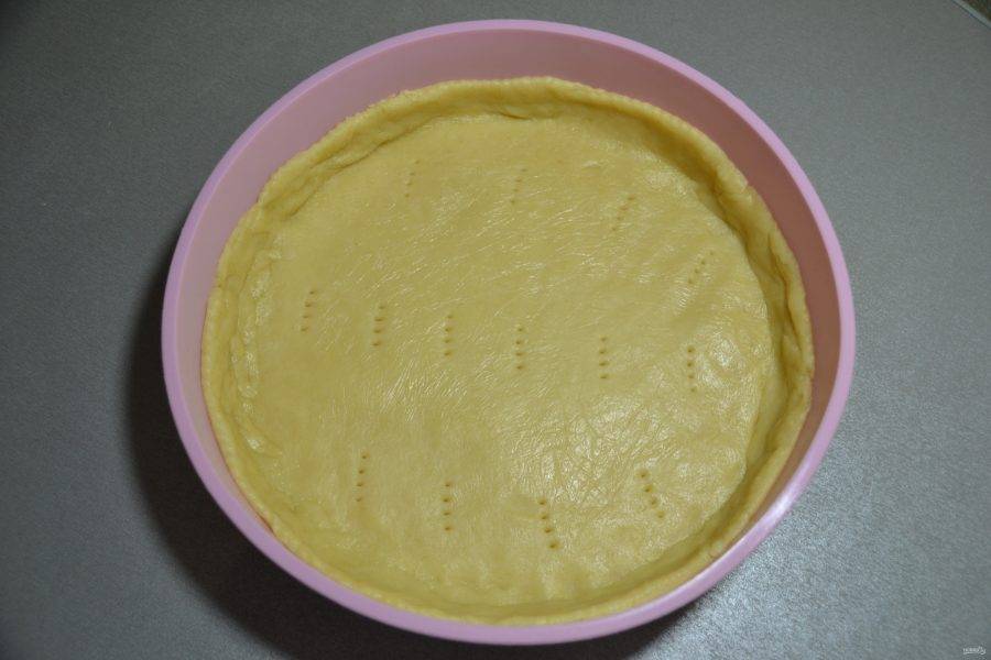 Выложите тесто в форму, предварительно раскатав в пласт и перенеся в форму, оформите бортики, наколите вилкой дно и выпекайте 5 минут при температуре 200 градусов.