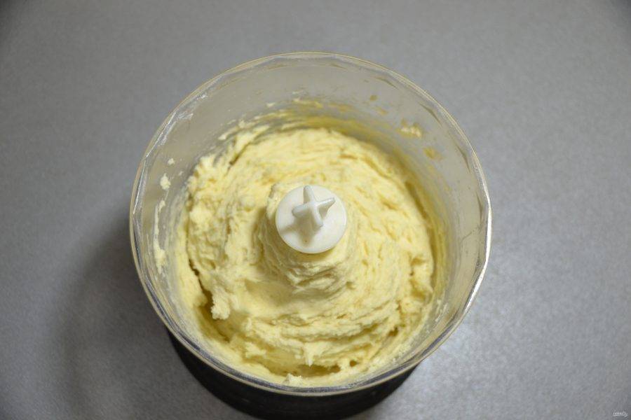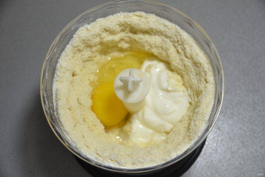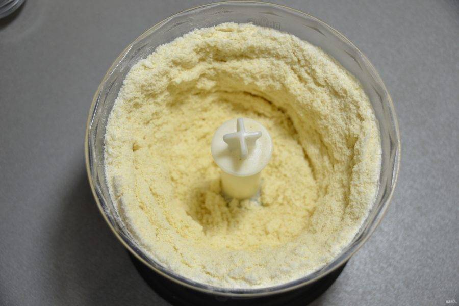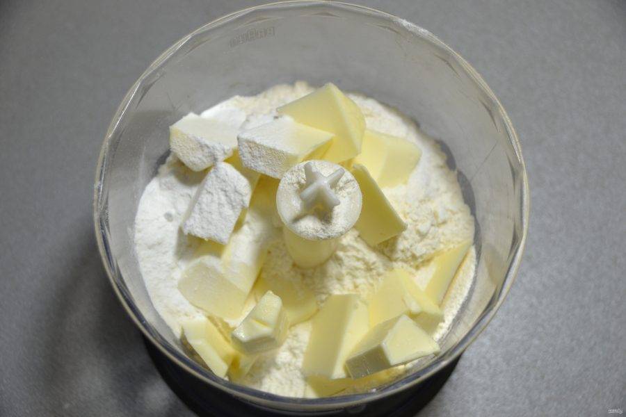 Положите в блендер 2/3 муки от общего объема, порезанное на кубики холодное сливочное масло. Добавьте соль и разрыхлитель для теста.