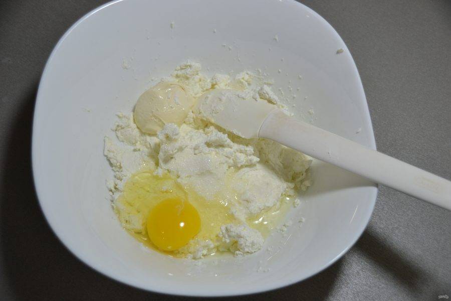 Вбейте в творог яйцо, добавьте щепотку соли и сахарный песок.