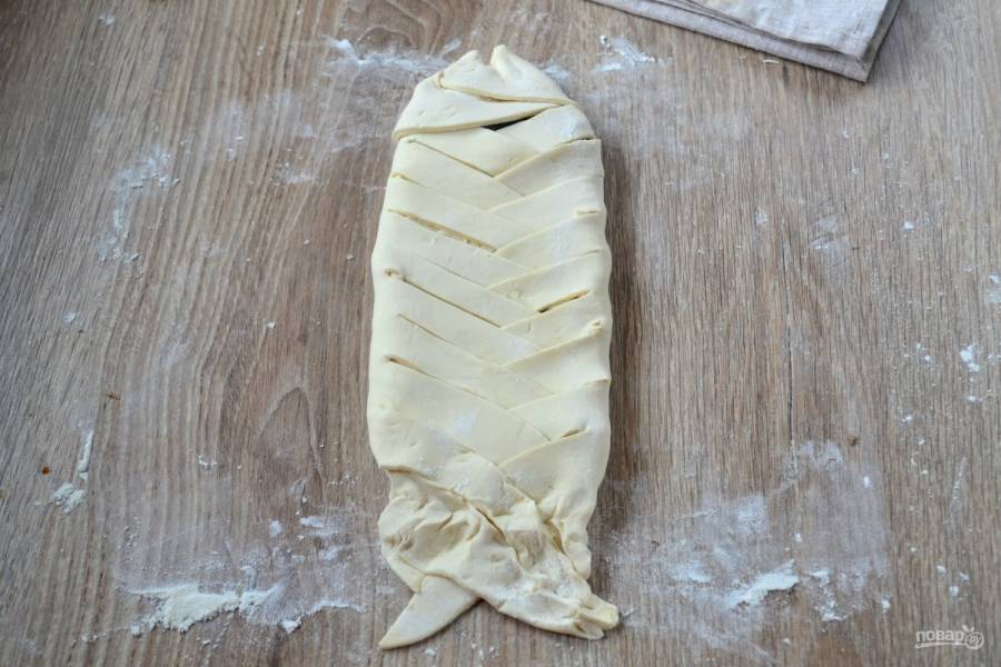 Выложите шпроты посередине, с обеих сторон на тесте сделайте надрезы, как показано на фото.