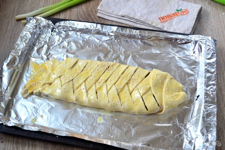 Переложите пирог на противень. Смажьте его взбитым яйцом и присыпьте кунжутом. Запекайте пирог в духовке 20 минут (температура 180 градусов).