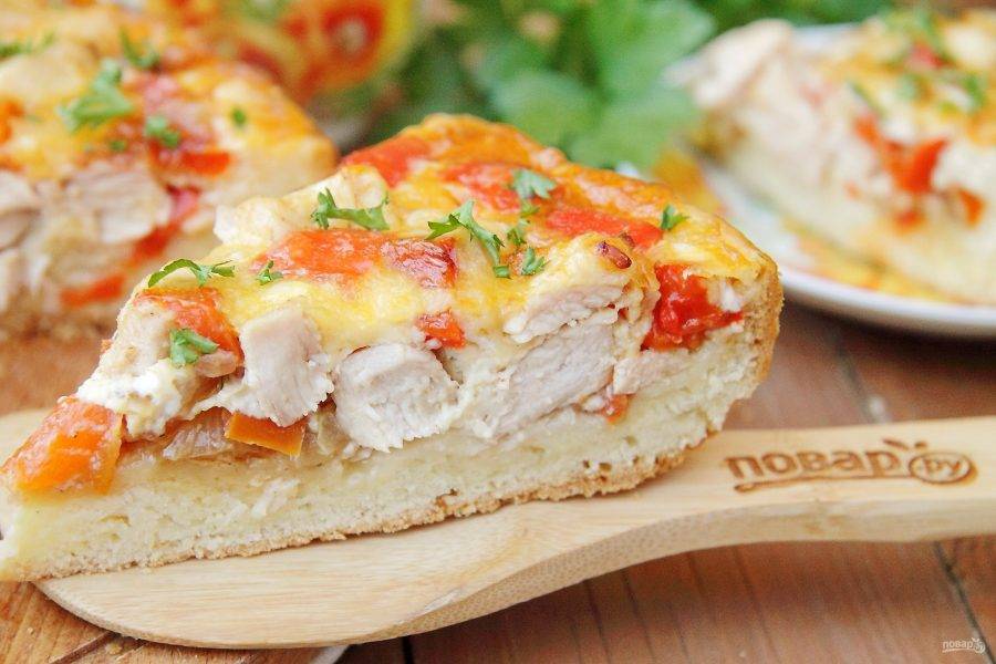 Остудите пирог 10-15 минут в форме, затем аккуратно достаньте и подайте на стол, по желанию украсив свежей зеленью. Пирог со сладким перцем и курицей готов.
