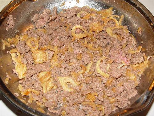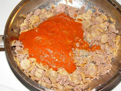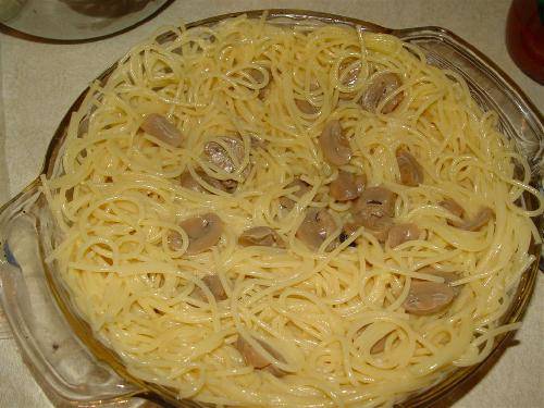 Укладываем начинку на основу из спагетти. Посыпаем сыром.