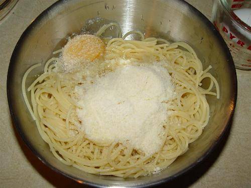 Отварите спагетти и смешайте их с сыром пармезаном и яйцом.