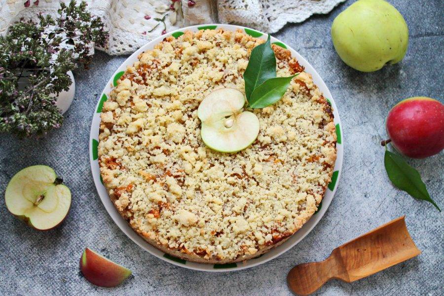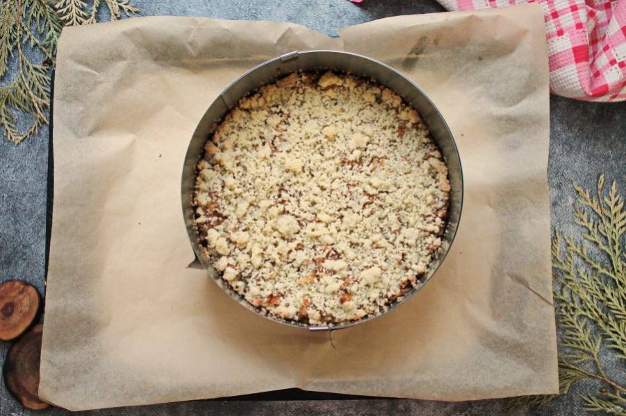 На крошку выложите яблочную начинку и немного прижмите. Сверху засыпьте все оставшимся сухим тестом.