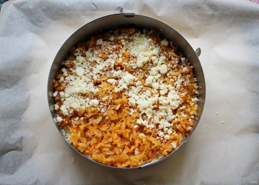 Дно разъемной формы диаметром 20 сантиметров застелите пергаментом и насыпьте половину сухого теста.