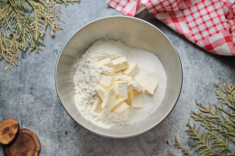 В миску насыпьте сахар, просейте муку и выложите холодное масло порезанное на кусочки. Перетрите все в крошку.