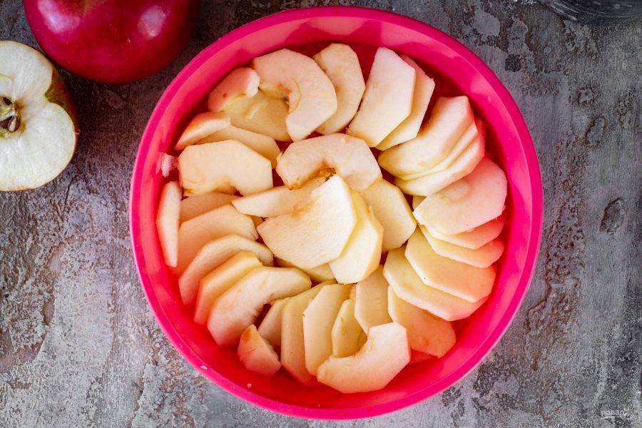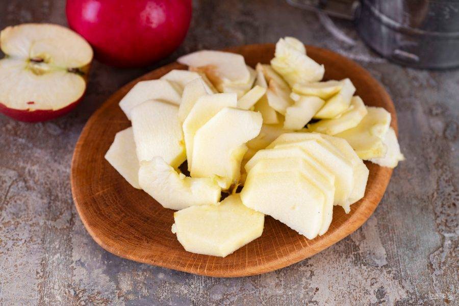 С яблок снимите кожицу и удалите семенной отдел. Яблочную мякоть нарежьте тонкими ломтиками.