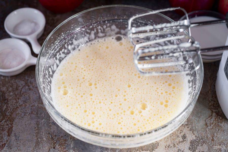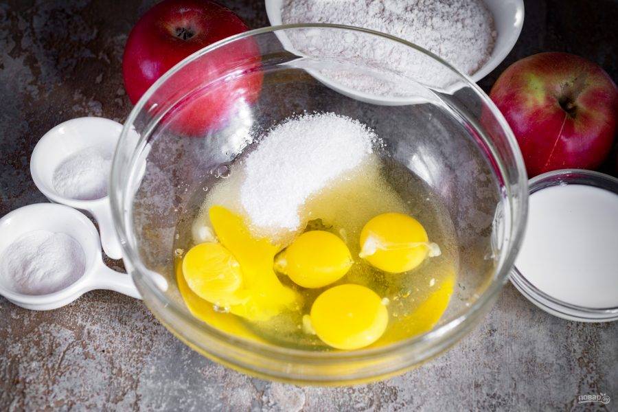В просторную миску вбейте яйца и добавьте сахар.