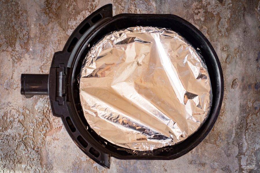 Форму с будущим пирогом накройте пищевой фольгой и установите в чашу аэрогриля. Выпекайте пирог в аэрогриле в соответствии со следующим режимом: 30 минут выпекайте при температуре 180 градусов, затем выдвинете чашу из аэрогриля, снимите с формы фольгу и уже без фольги выпекайте еще 15 минут.