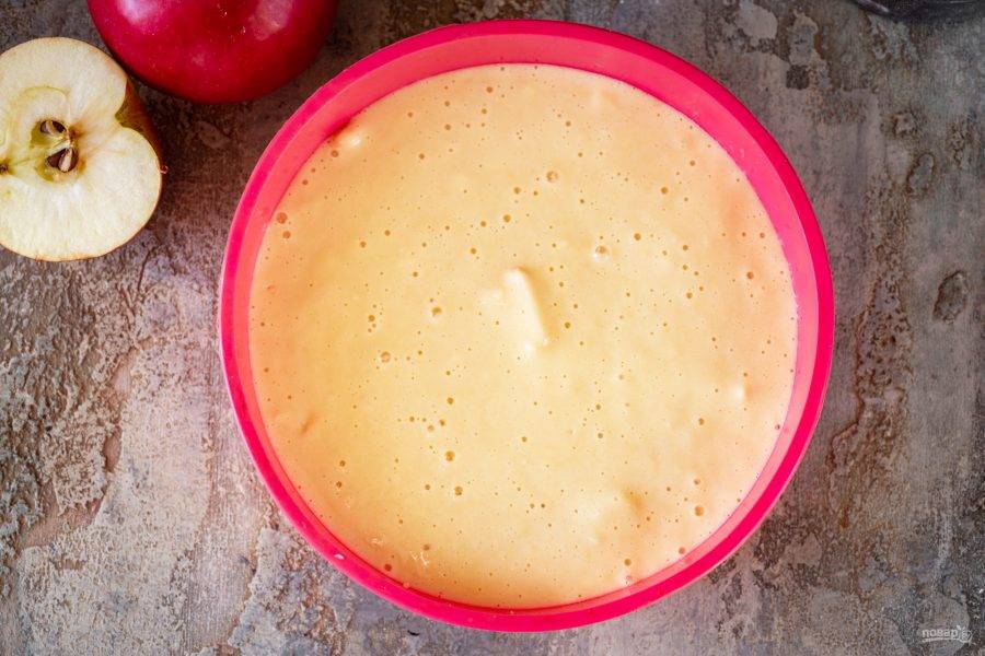 Поверх яблочных ломтиков выложите воздушное тесто, лопаткой равномерно распределяя.