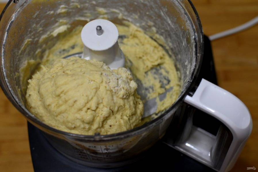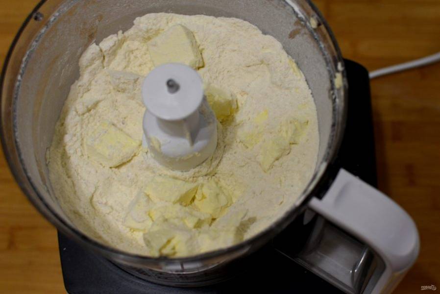 Обжаренные орехи смелите не слишком мелко и смешайте с мукой, сахаром, солью и содой. Высыпьте смесь в чашу блендера и добавьте кусочки размягченного масла. Пробейте в крошку.
