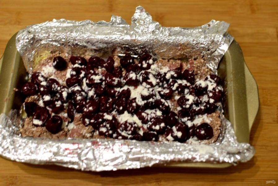Выложите творожную начинку на корж, сверху уложите предварительно размороженную и стекшую вишню, припудрив ее крахмалом. Верните пирог в духовку еще минут на 15. Творог должен схватиться по краям.