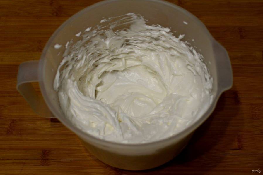 Оставшиеся белки взбейте до мягких пиков. Подсыпая сахар, взбейте до жестких пиков. Влейте ароматизатор и еще раз взбейте.