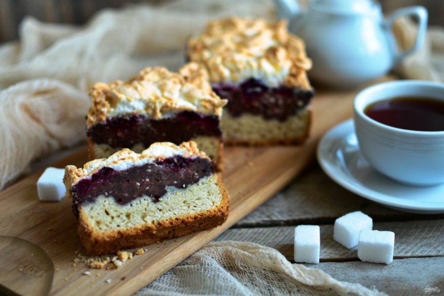 Вкуснее оставить пирог на ночь открытым, чтобы безе дополнительно подсохло и хрустело по краям, и лишь затем разрезать.