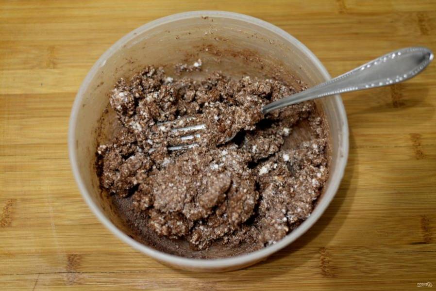 Смешайте творог с шоколадным пудингом и сахаром, добавьте желток и хорошо перемешайте. Начинка не должна быть излишне влажной!