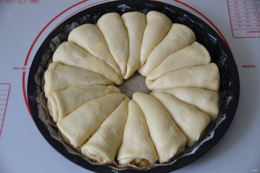 Выложите заготовки из теста в форму диаметром 25-27 см., смазанную сливочным маслом и слегка присыпанную мукой. Дайте расстойку 40-50 минут.